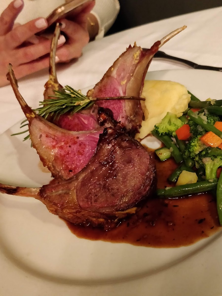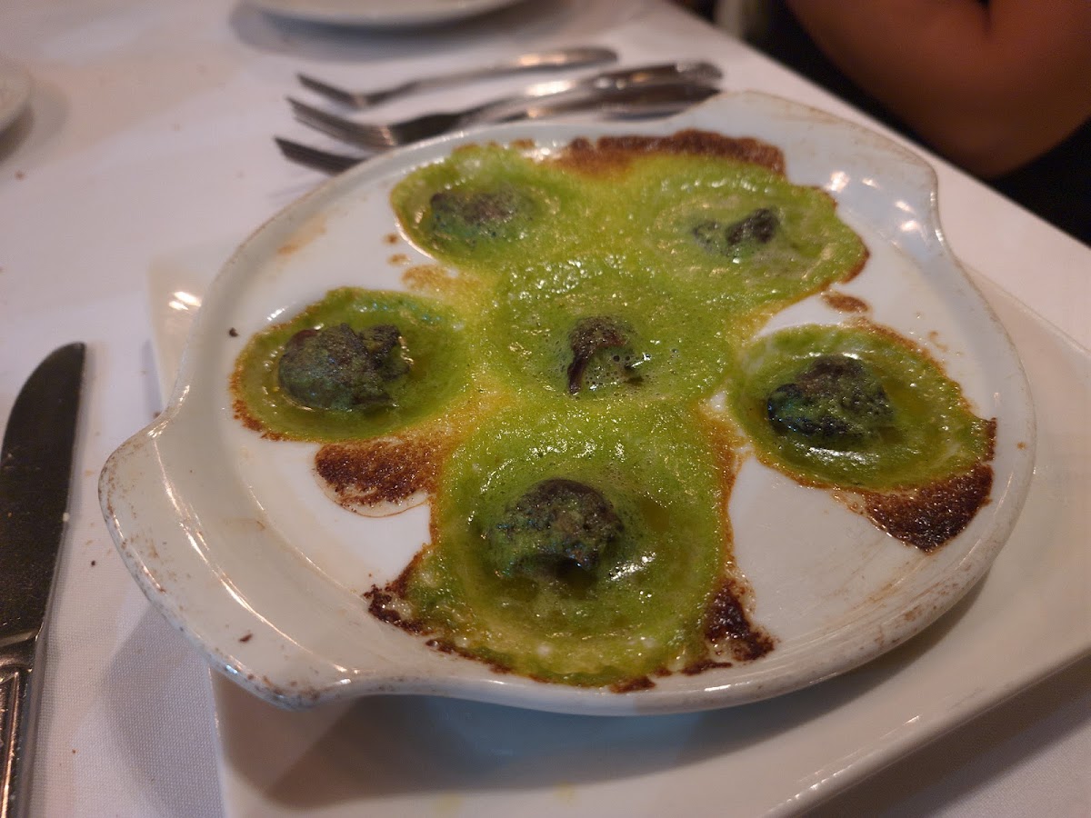 We have escargot bourguignonne and crab cake as appetizers. For main, we have Caesar salad with grilled chicken, steak, duck a l'orange, shrimp with fettuccine & grilled chicken. My duck was a bit over done but I still liked it. The skin is a bit crisper. The fettuccine tasted the best. It was nice and garlicky. If I'm not mistaken it may be freshly made pasta. My son's medium rare steak came out over done. Then the 2nd came out within 5 minutes. It was undercooked. Then they had to take it back in the redo. I didn't try the salad nor the chicken. The creme brulee was great. The chocolate mousse for our anniversary gift was also decent. I just don't like chocolate made into anything. It just doesn't taste as good as eating the chocolate alone.