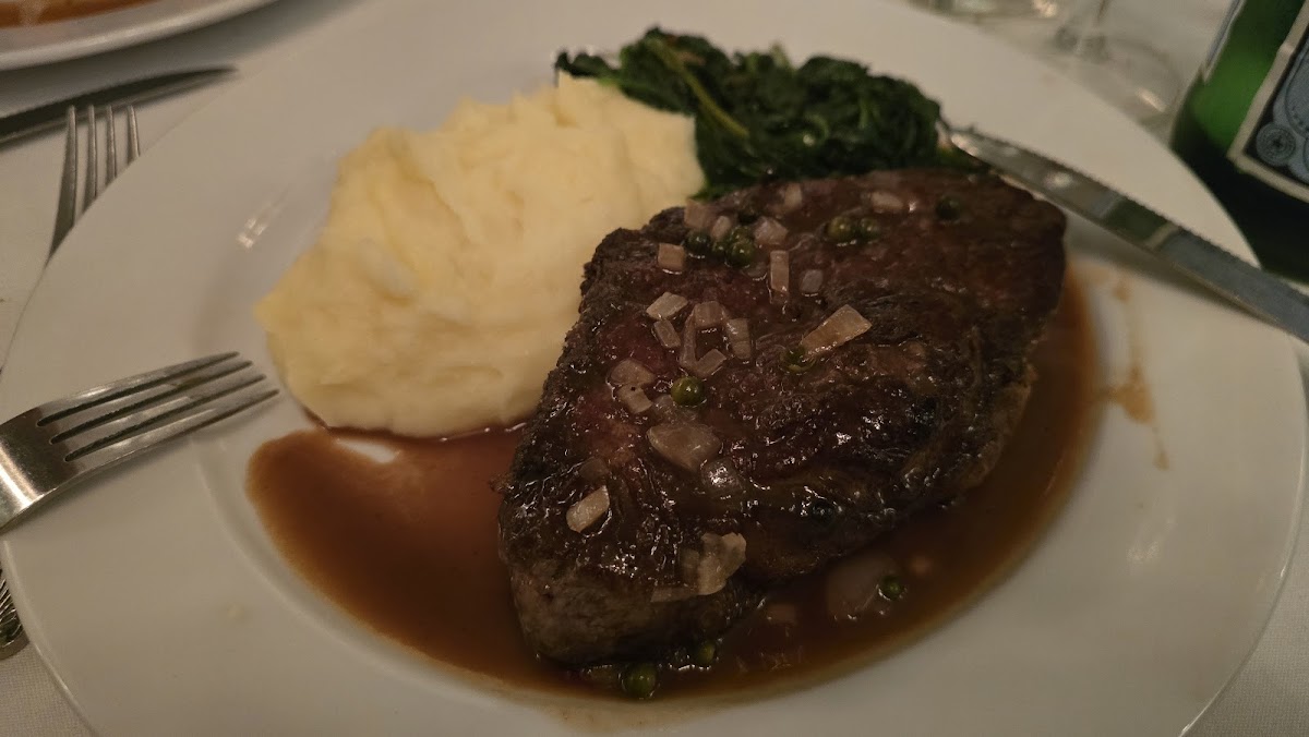 I ate that liver up like there was no tomorrow. Lobster bisque was great. My fettuccine was decent. There was more vegetables, etc. than pasta on the plate, in my opinion. They had a rolling dessert display, too.